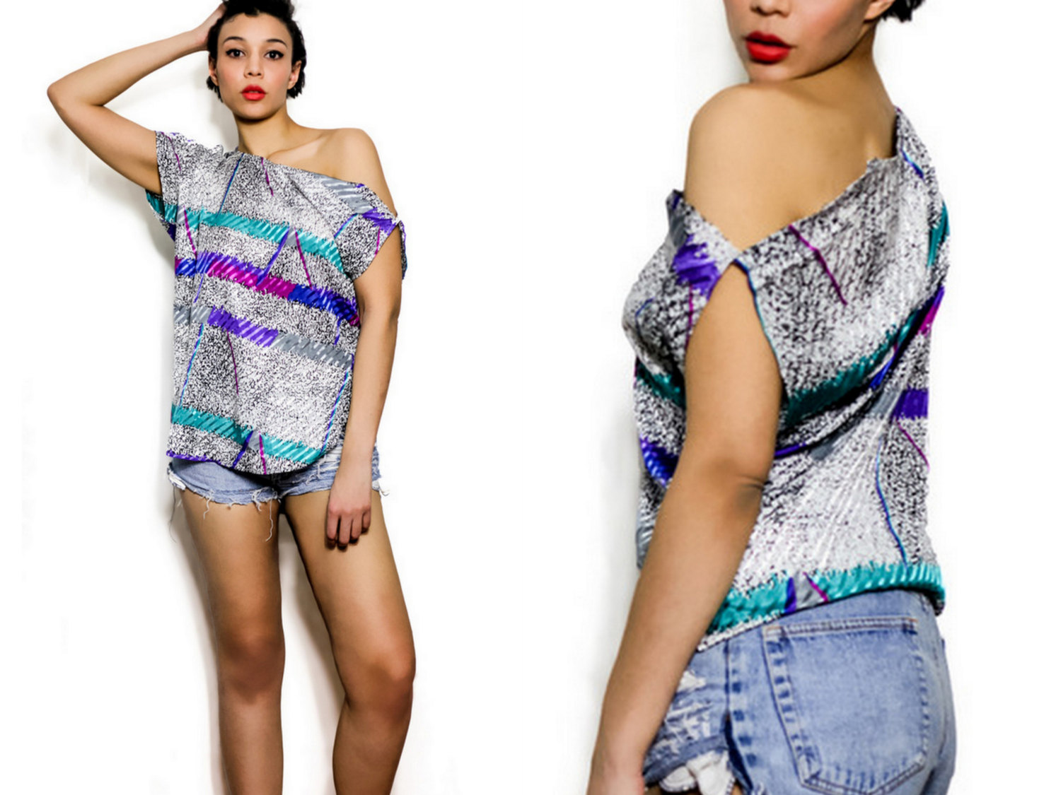Vintage S / M / L 1980s Asymmetrical Off The Shoulder Shirt Top w/ Graphic Print Small Medium Large