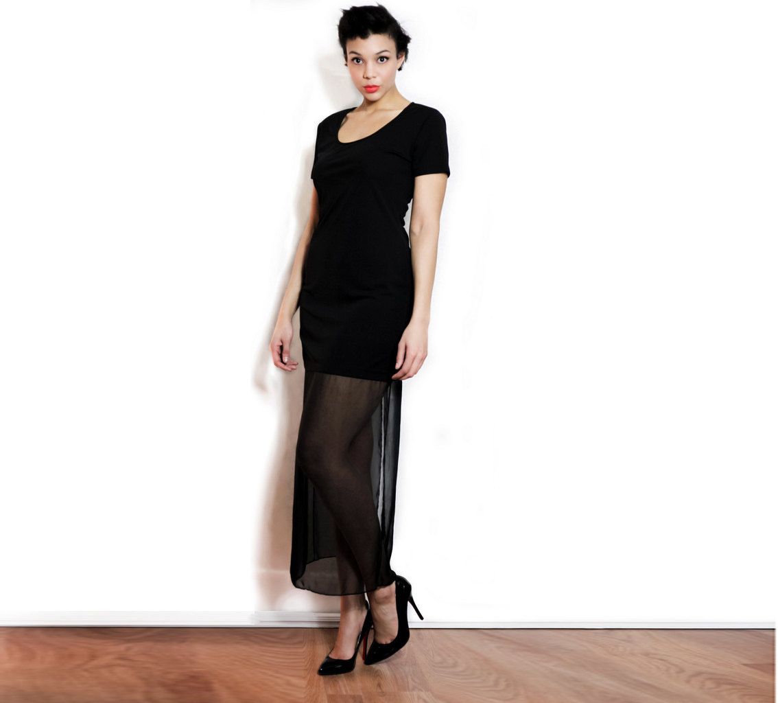 This long black semi sheer dress falls right above the knees then follows with a sheer sexy block at bottom and closes with a back zipper.