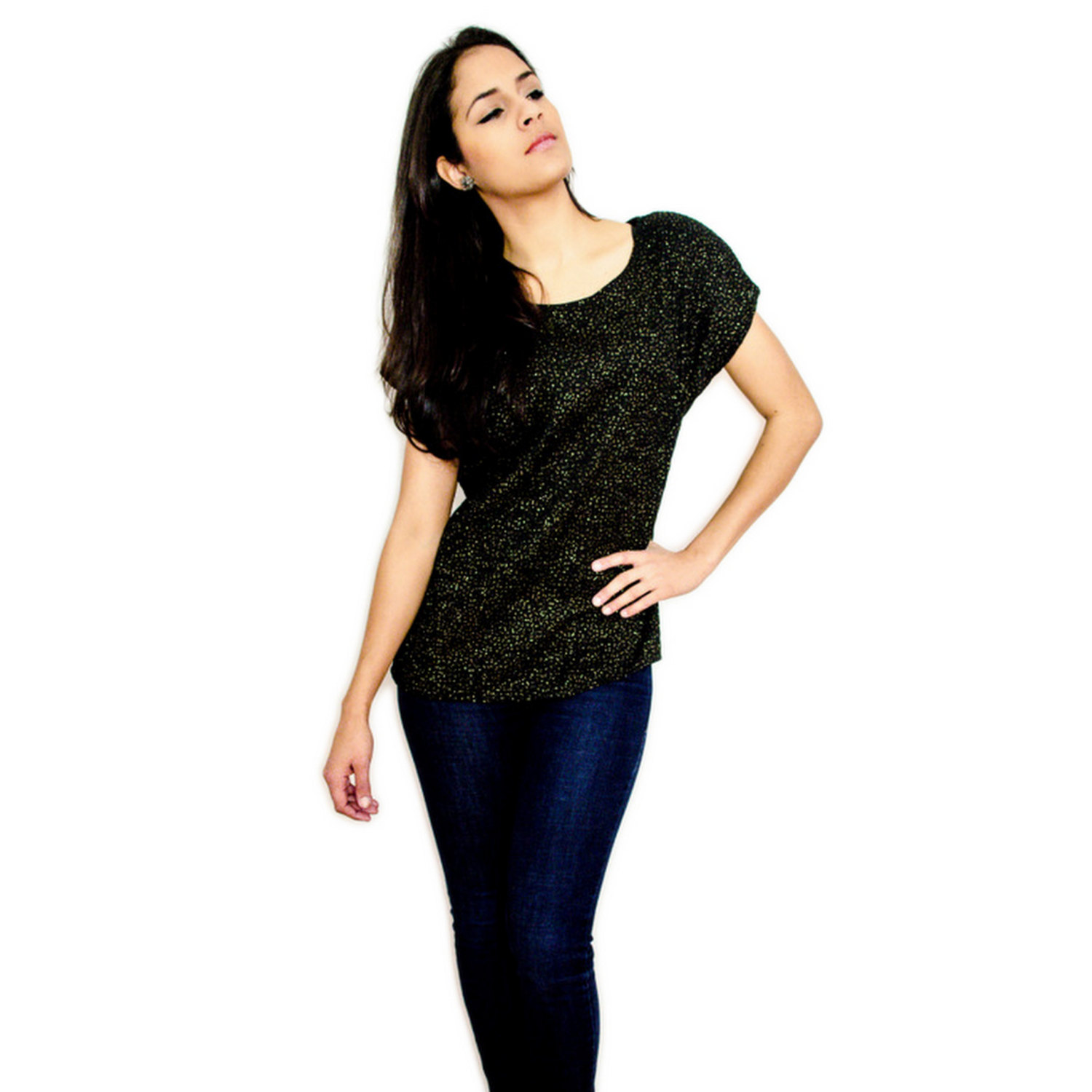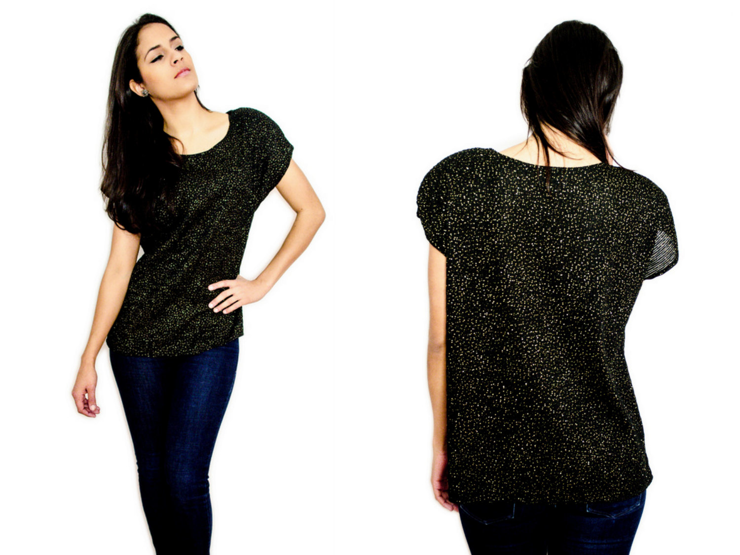 This funky black top with shoulder pads has a unique crinkle effect all over and is completely covered in gold spots. Pair with black skinnies or short shorts for a fun look.