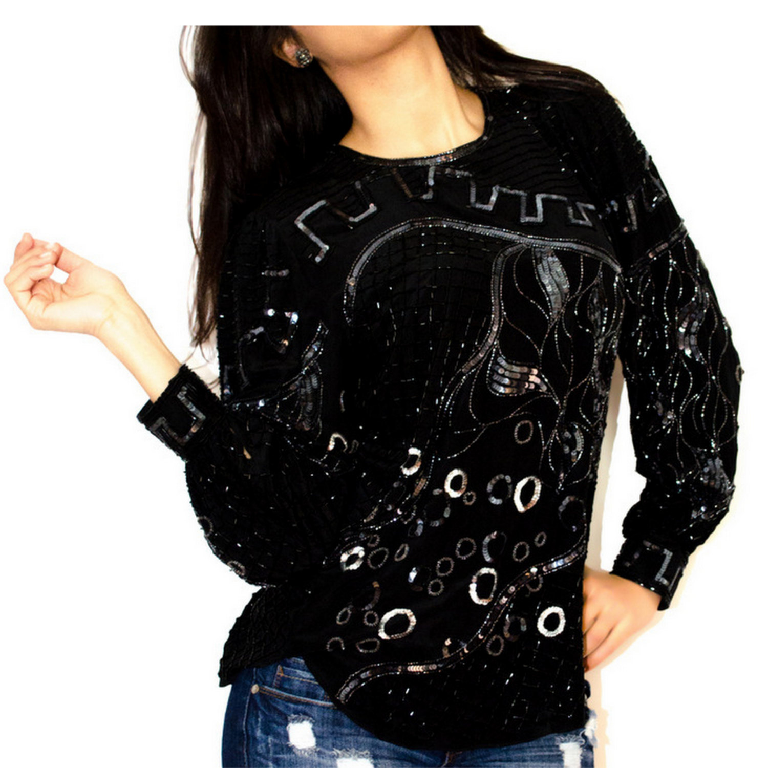 Vintage S/M 1980'S Black Silver Silk Sequin Beaded Top Small Medium