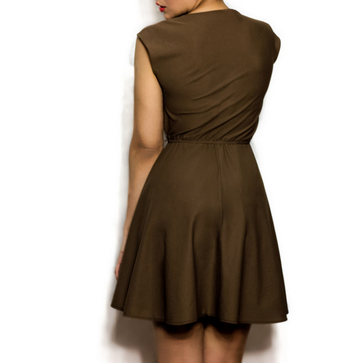 This mini skater dress features a flower print in shades of brown and green, an elastic waist for the perfect fit, and a full bottom skirt.