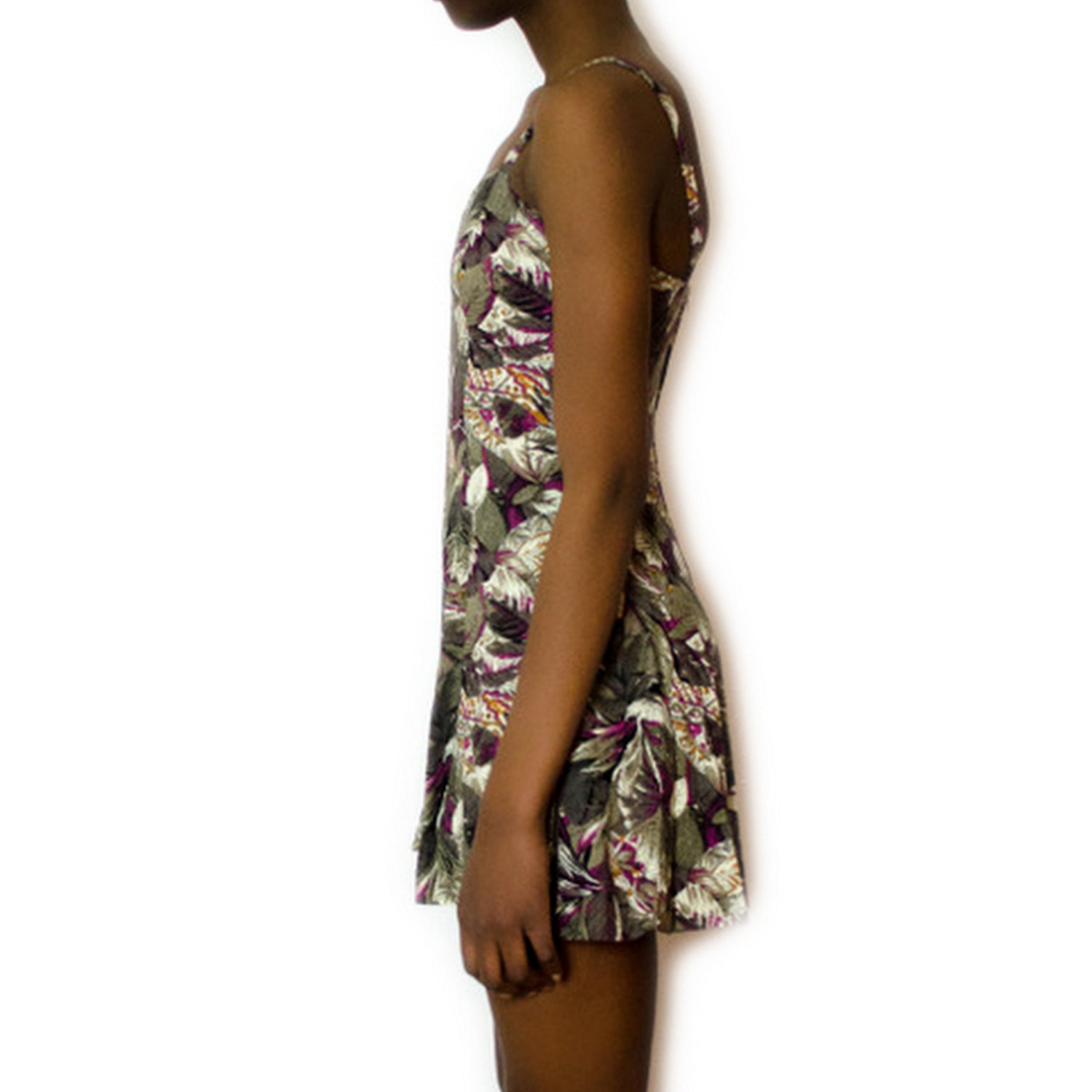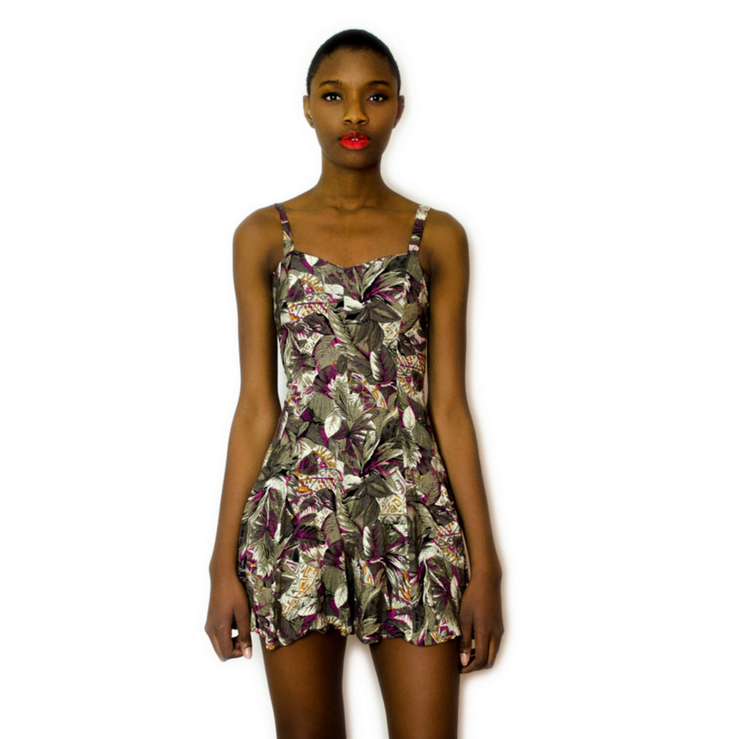 This adorable vintage romper outfit features a slim fit through the waist, a subtly pleated free flowing bottom and closes in the back with a zipper.