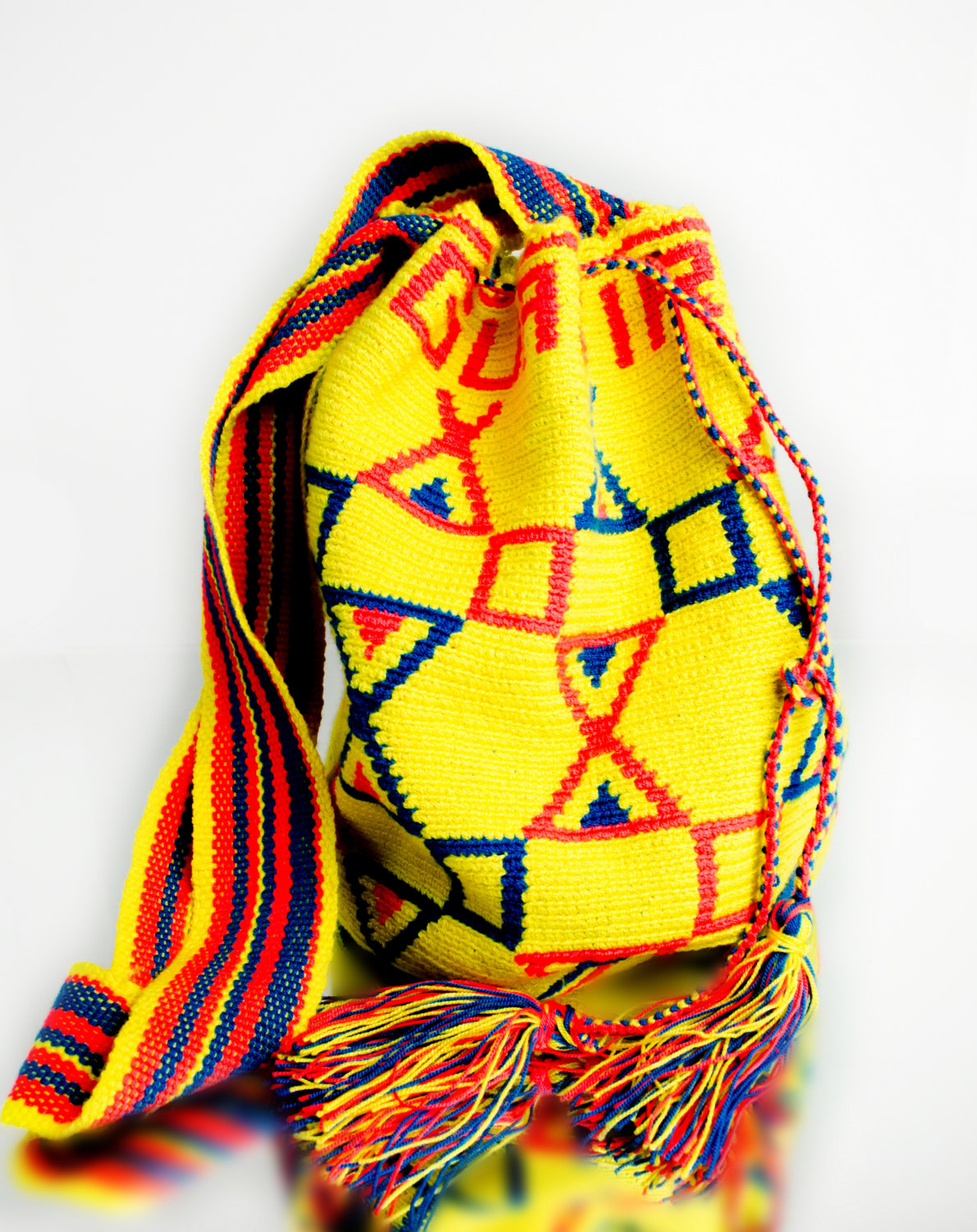 It features a lovely geometric pattern with the words Wayuu Guajira along the top as well as a draw string and a thick shoulder strap.