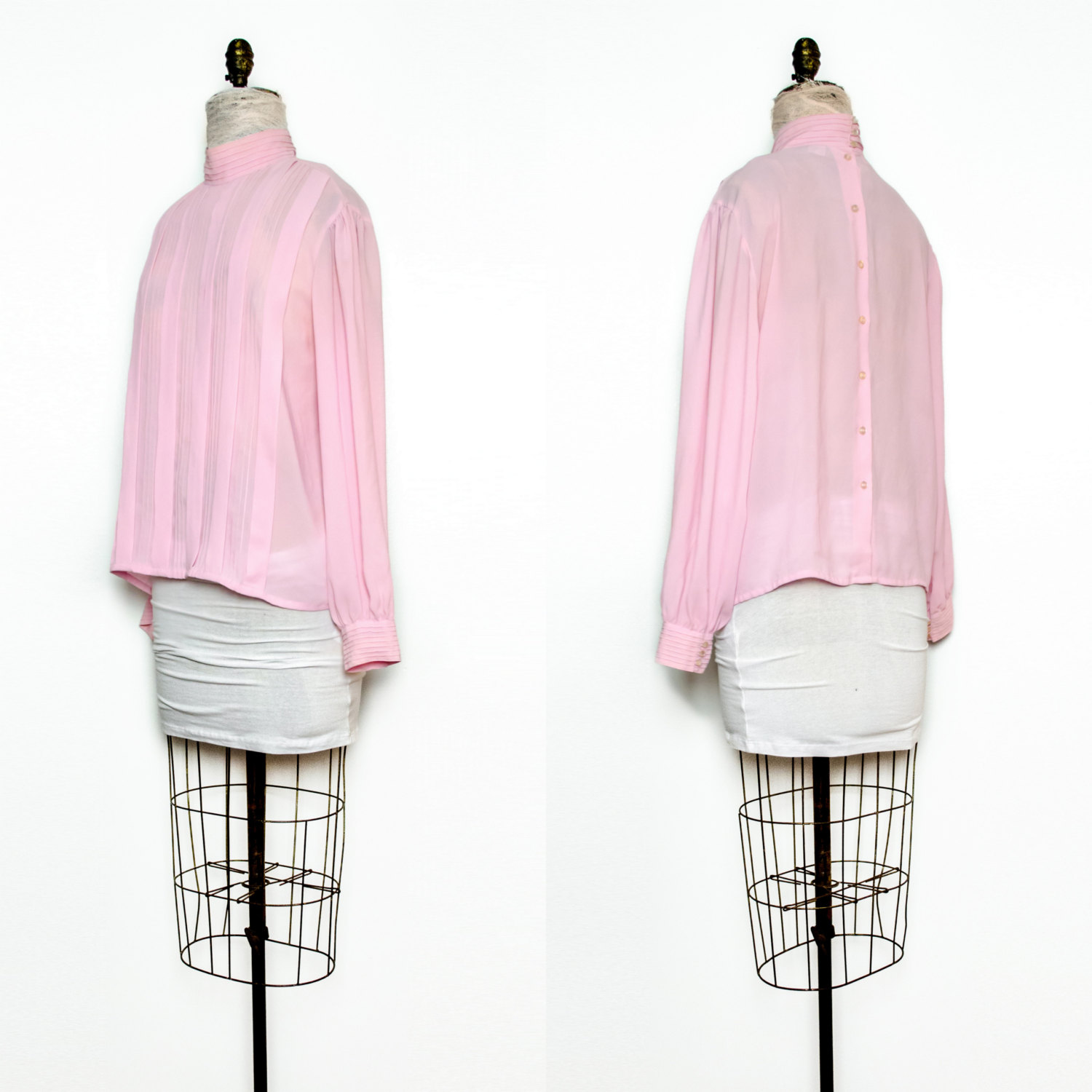 Home - Vintage M / L Pink Top Shirt Blouse Button Up Pleated High Collar Sheer Medium Large
