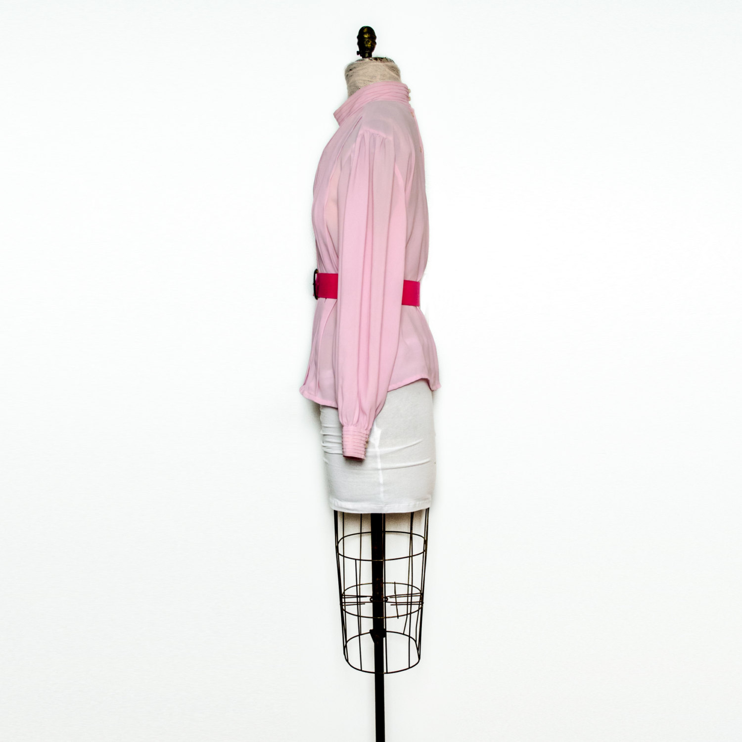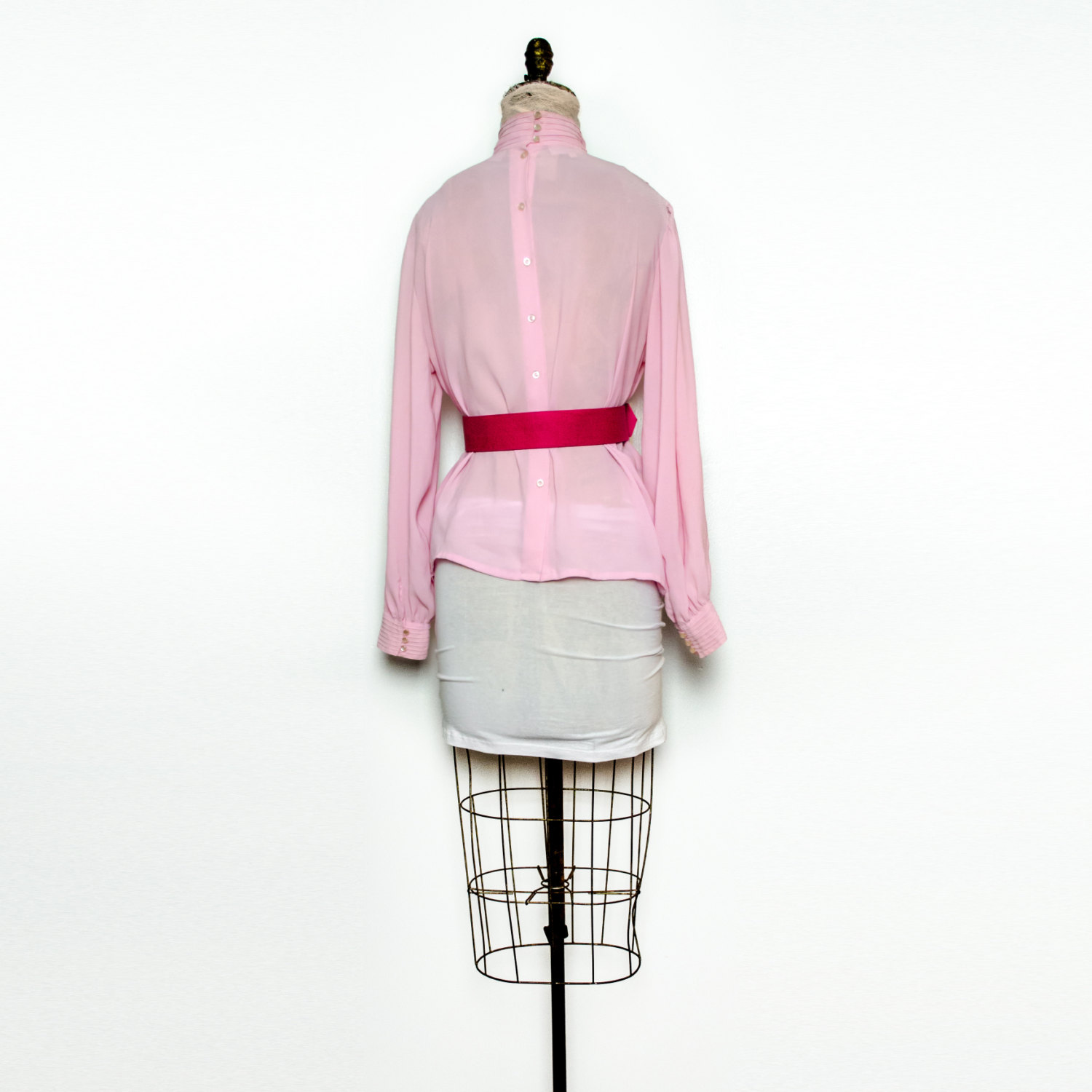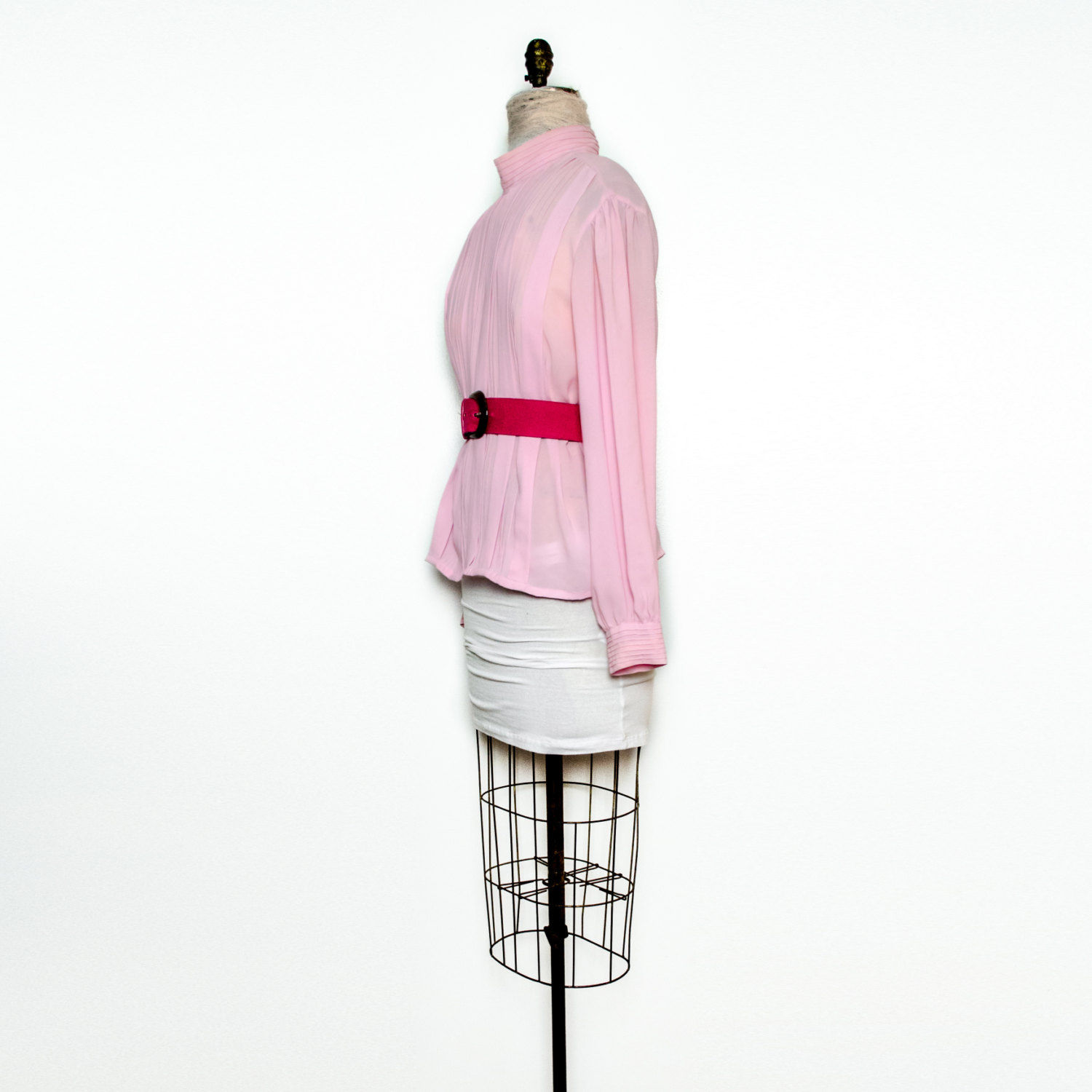 Vintage M / L Pink Top Shirt Blouse Button Up Pleated High Collar Sheer Medium Large