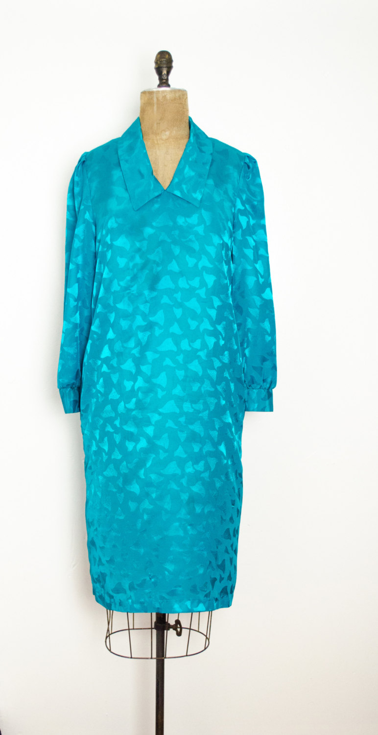This simple green shift dress features a peter pan collar, long sleeves and is covered in an abstract pattern in various shades of green.