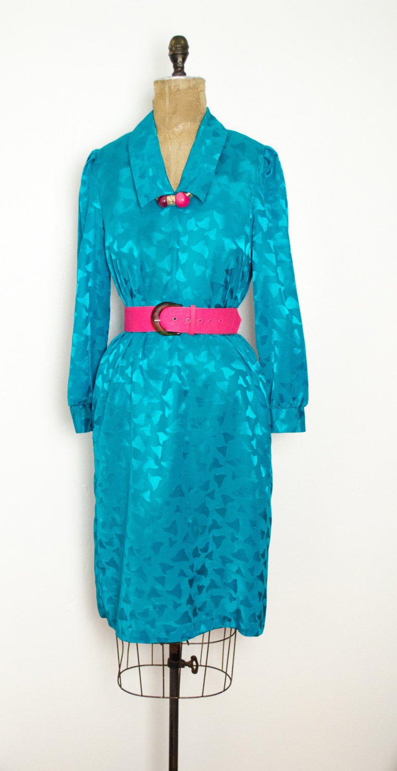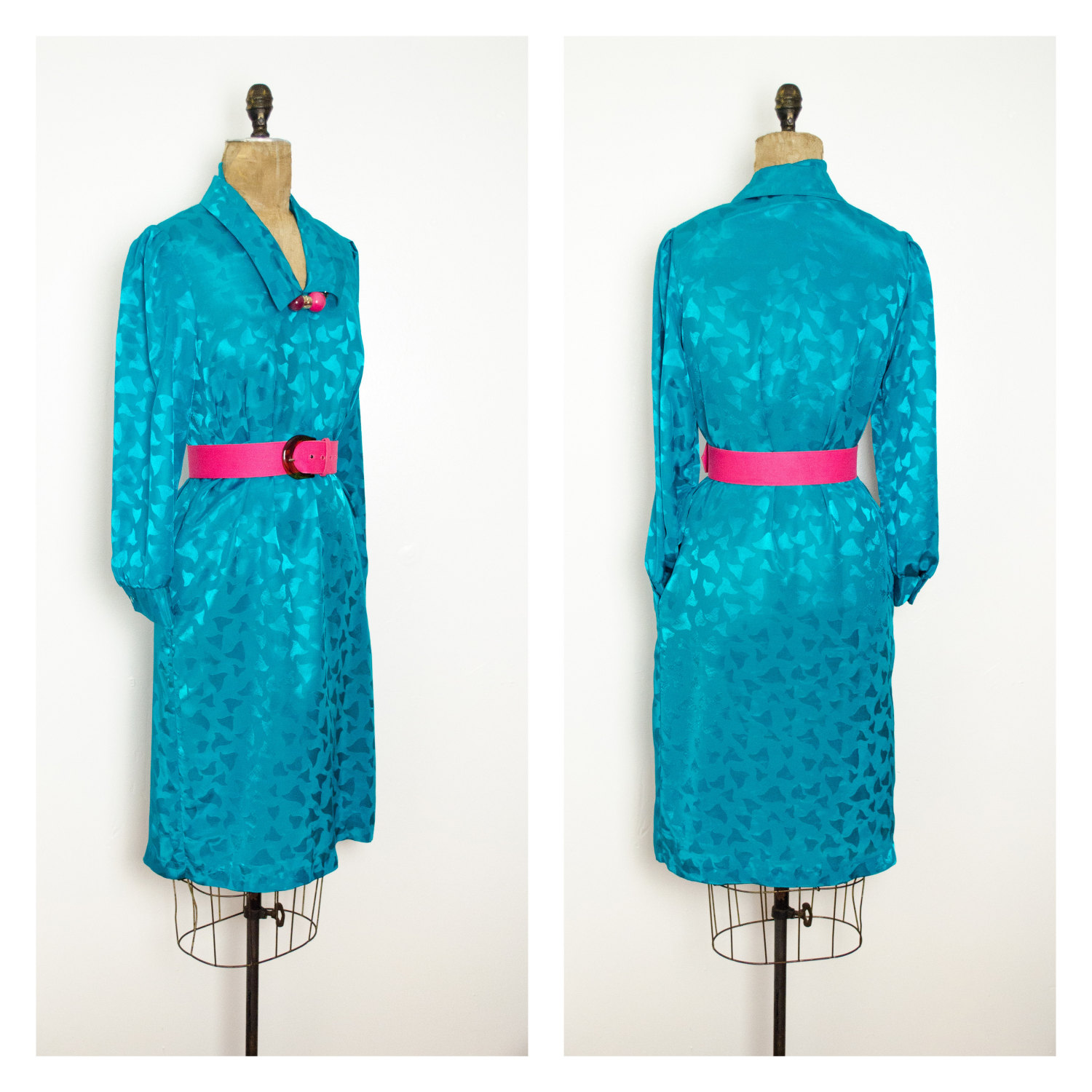 Vintage M Green Dress Shift Short Midi w/ Abstract Pattern Medium Retro Mad Men Mod Hippie