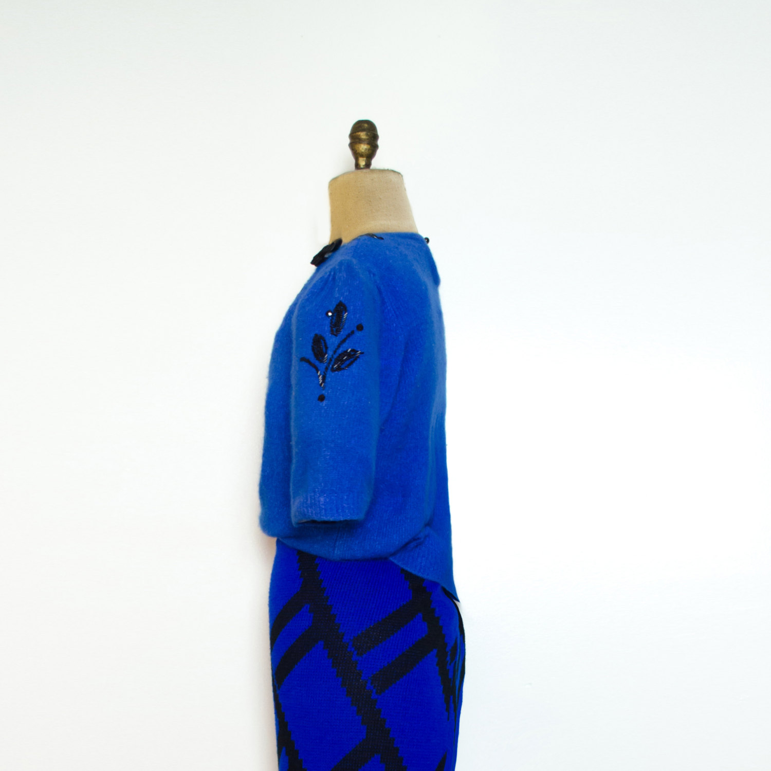 This bold blue angora sweater features black rosettes and beaded leaves along the neck line as well as on both short sleeves. It also has padded shoulders and encloses at the back with buttons.