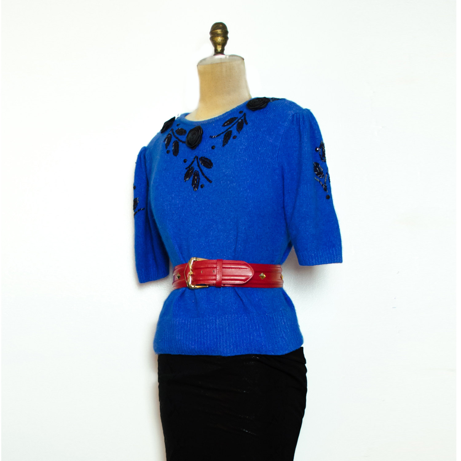 Home - Vtg Royal M / L Blue Sweater Top Shirt w/ Black Roses Rosettes Silk Beaded Beads Short Sleeve Medium Large Angora