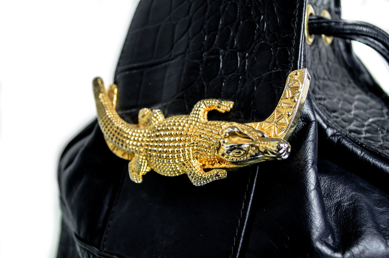 The clasp features a gold tone alligator body embellishment with an interior magnet for closure.