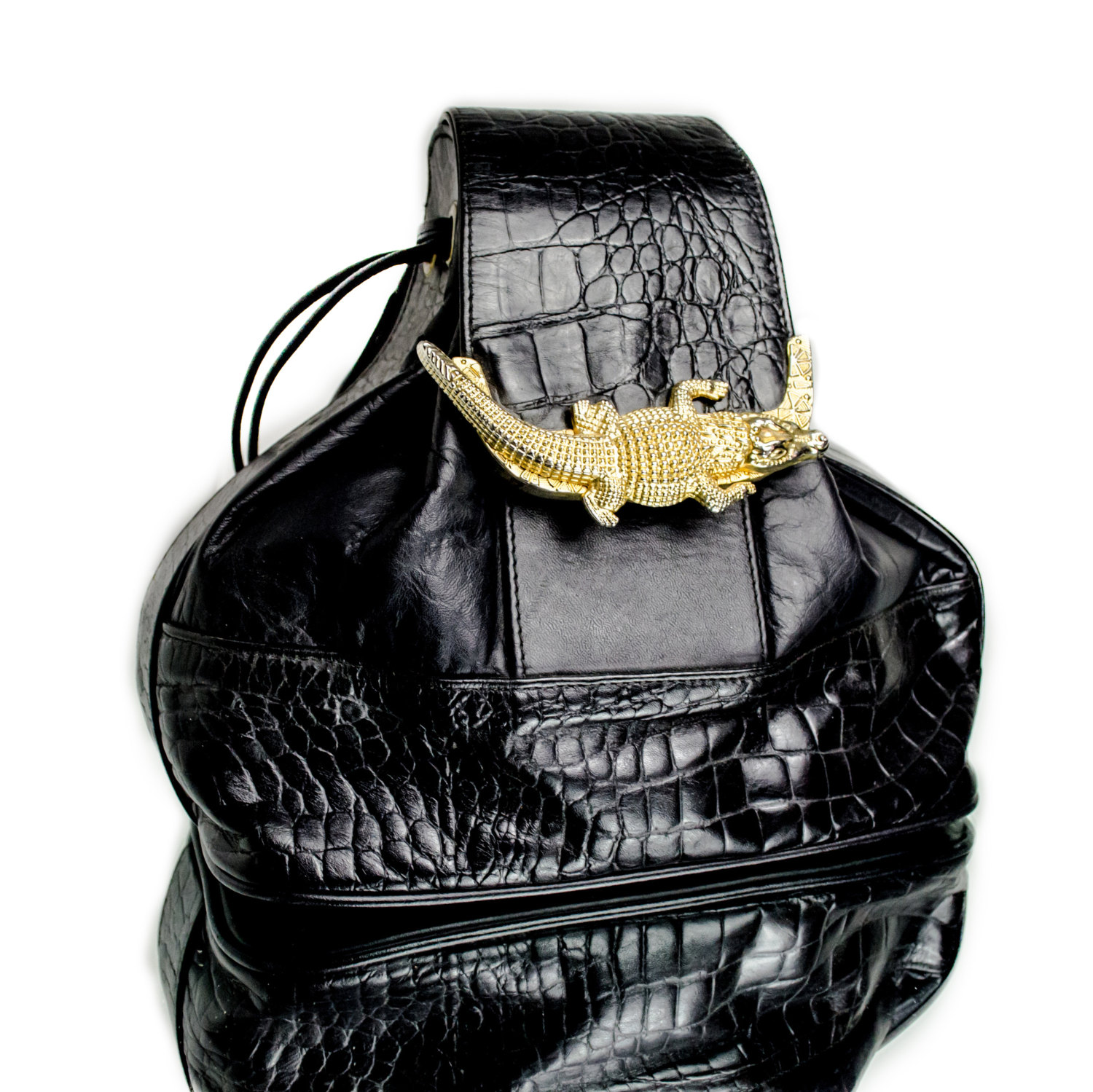 This unique statement bag features an alligator texture, gold tone brass hardware, a drawstring strap and an interior zippered compartment.