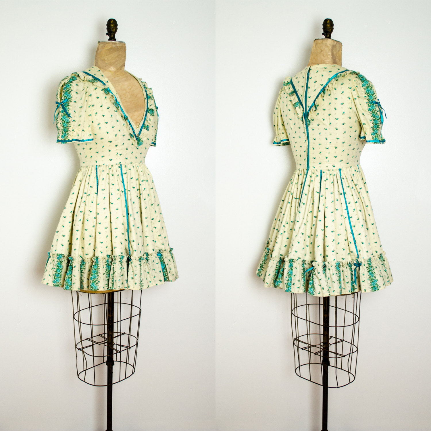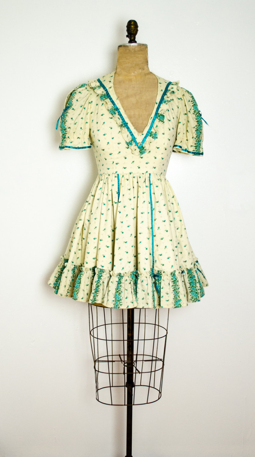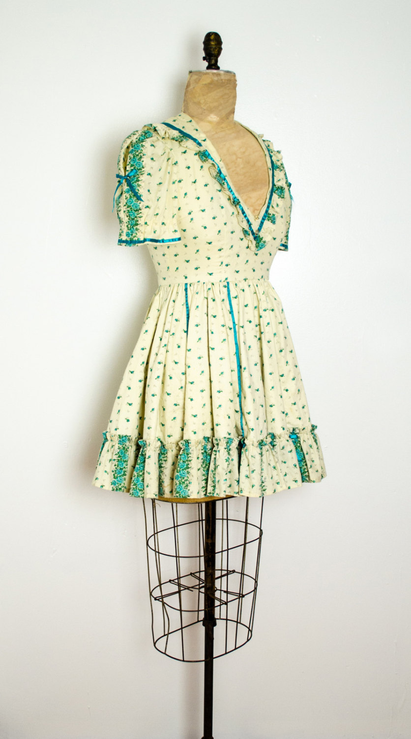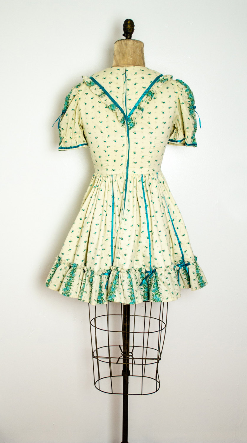 This short prairie dress features an embellished neckline, printed green flowers all over the cream fabric, and both ruffles and bows at the hem, neckline and along the sleeves. With a full bottom skirt, this vintage mad men dress is simply fabulous