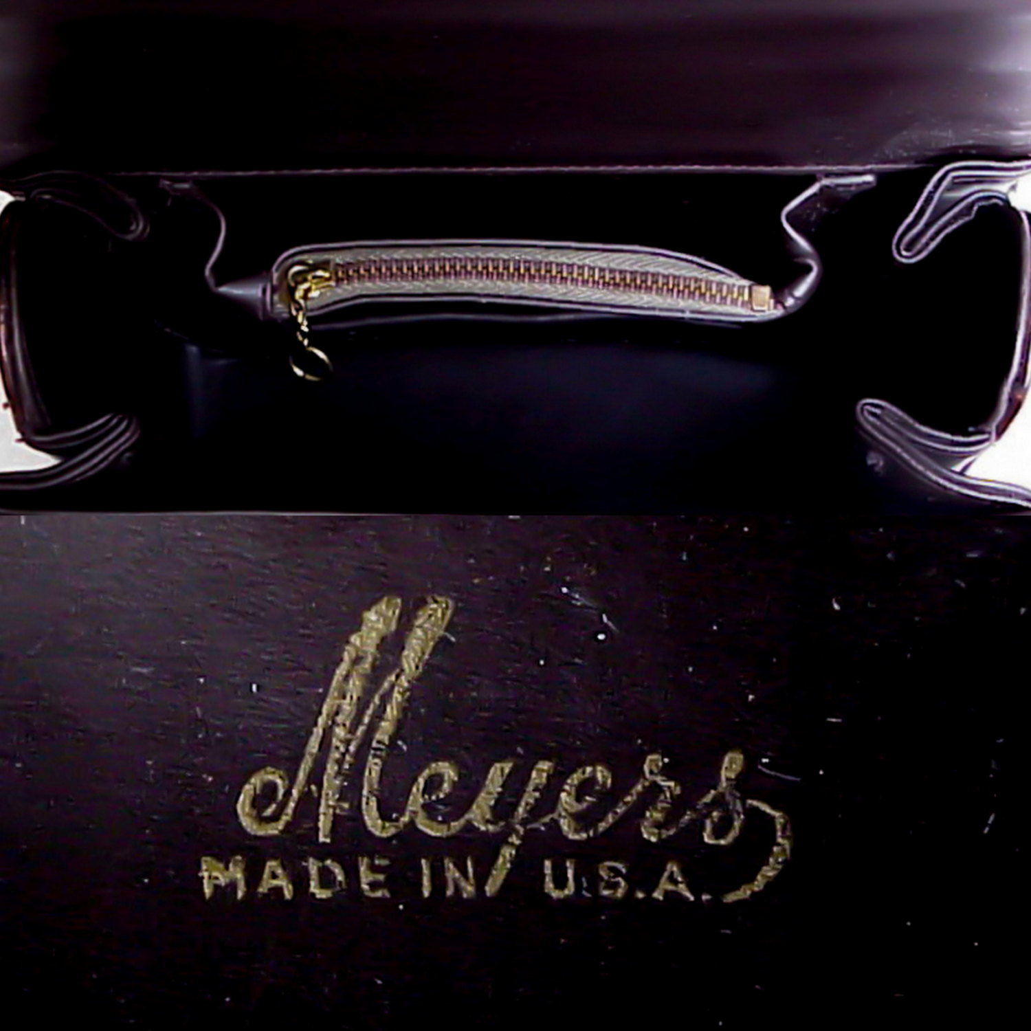 This pristine vintage box bag Meyers features gold tone hardware at the handle and closes with a switch.