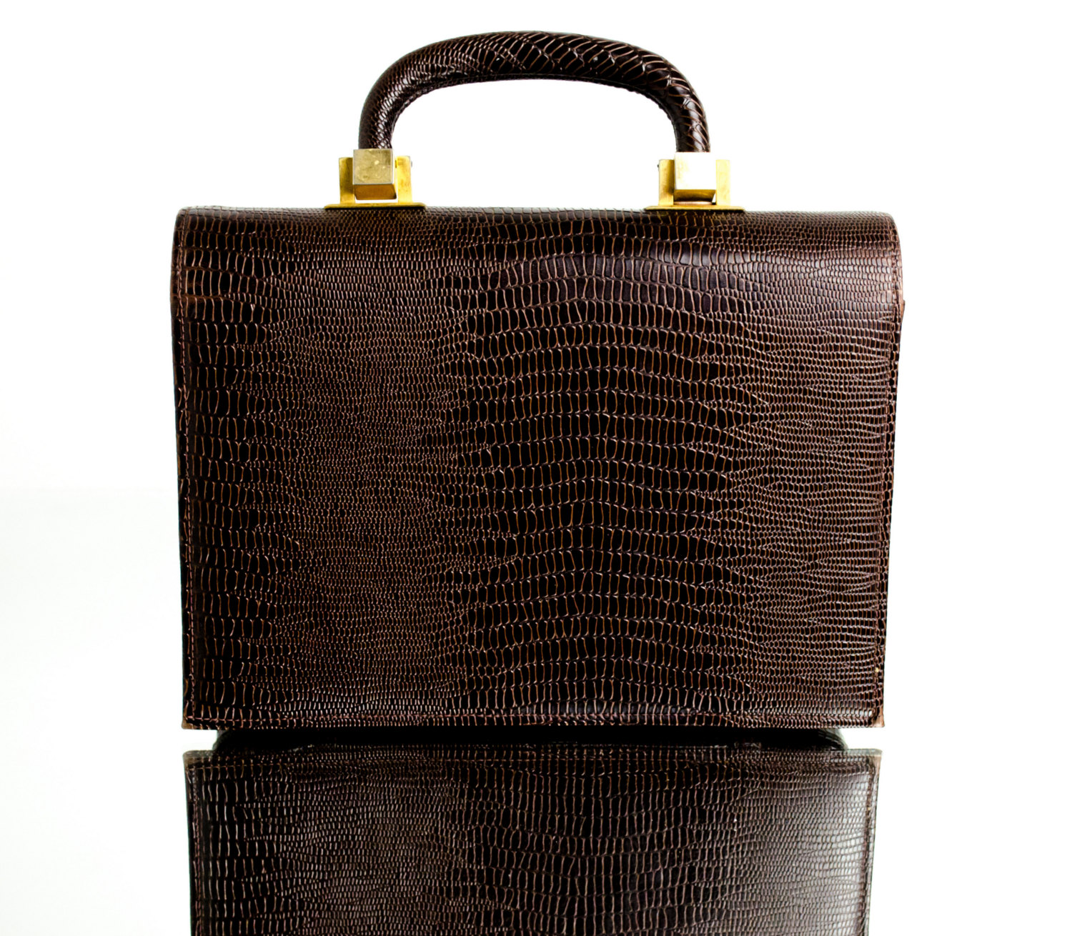 Home - Vintage Brown 1950s Box Bag Clutch Purse Meyers Kelly Gold Lizard Alligator Handbag Fifties