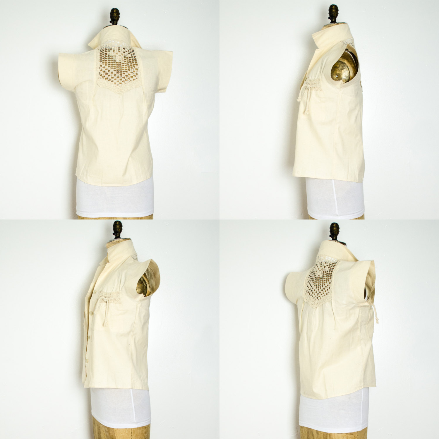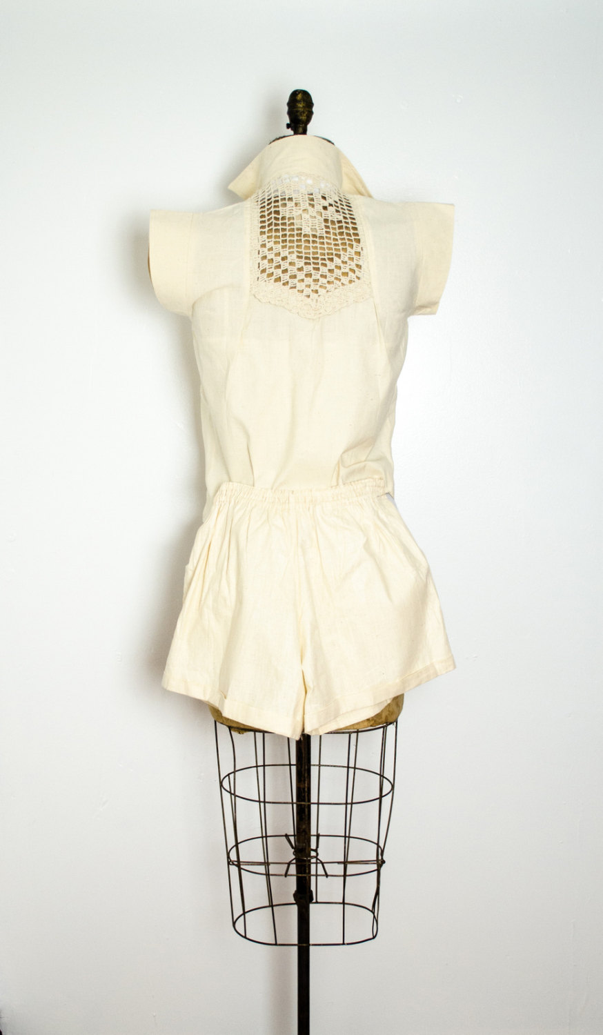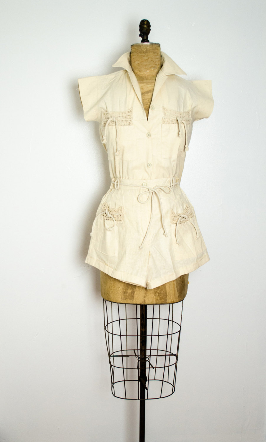 This safari style vintage set features a button up top with crochet details on the back and two front pockets; and shorts with matching details and front zip fastening.