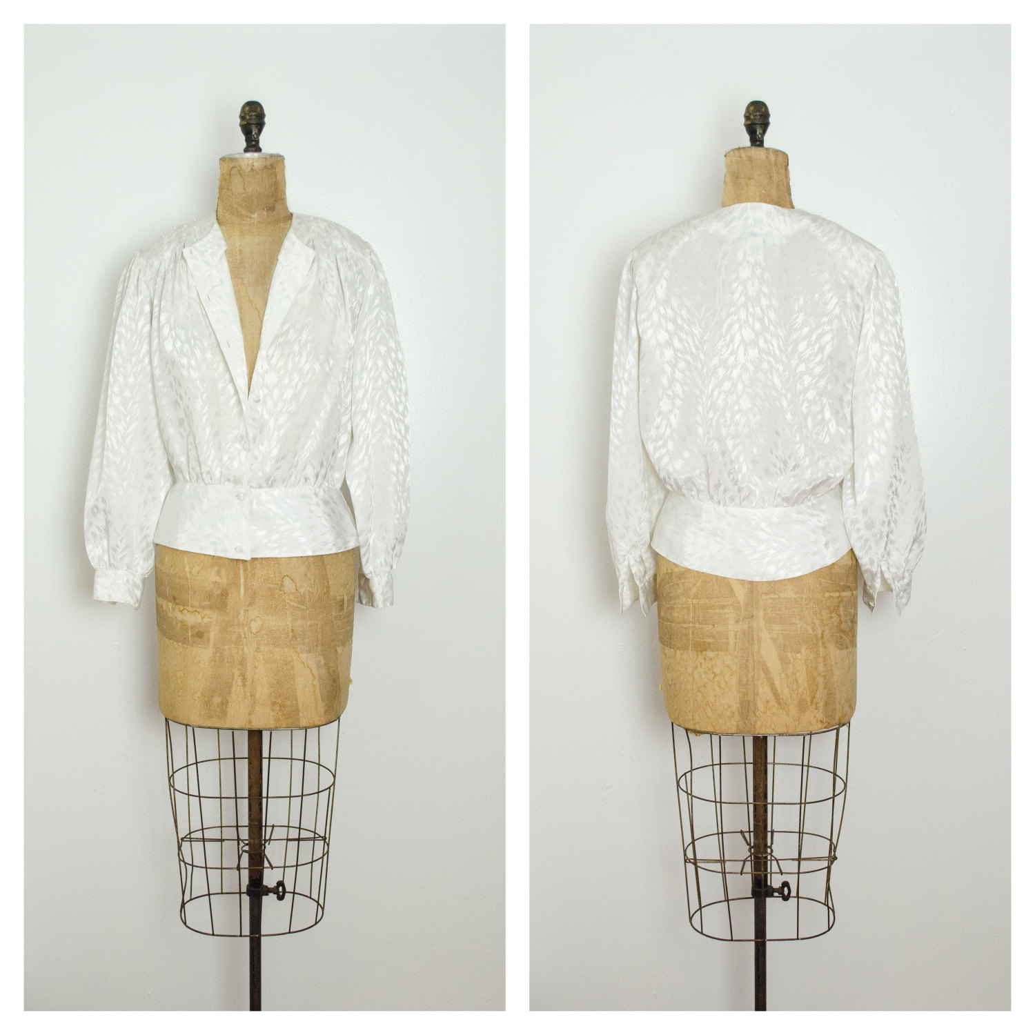 Home - Vintage M / L Shirt White Button Down Peplum Long Sleeve Pearls Retro Medium Large Mad Men